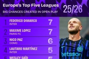 五大联赛运动战创造重大机会榜:迪马尔科7次居首,帕斯6次